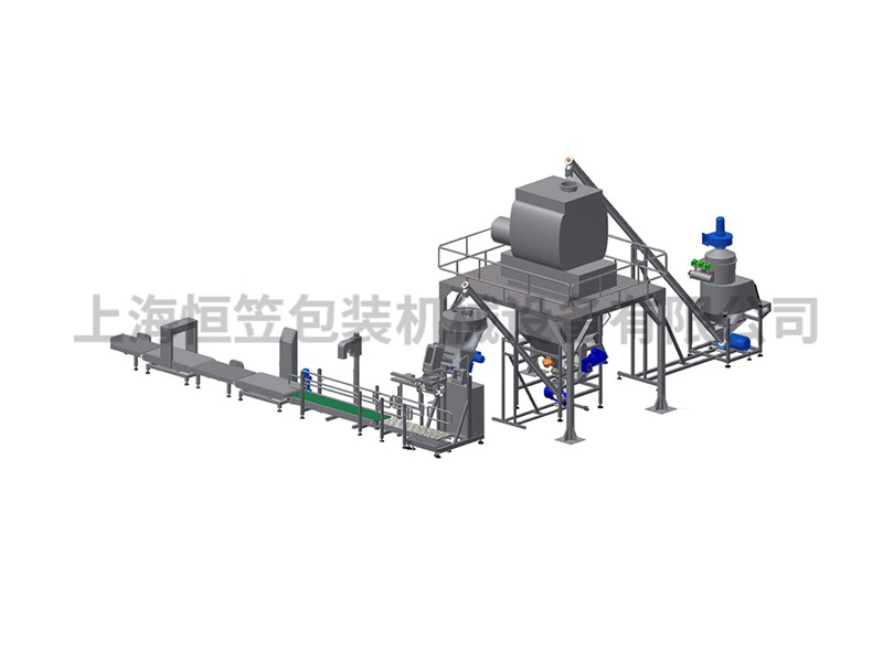 該生產(chǎn)線主要由無塵投料站、螺旋上料機(jī)、螺帶混合機(jī)、工作平臺(tái)、不銹鋼儲(chǔ)料倉、上料機(jī)、大袋包裝主機(jī)、縫包機(jī)、皮帶輸送機(jī)、重檢機(jī)、金檢機(jī)等組裝整套包裝生產(chǎn)線。
