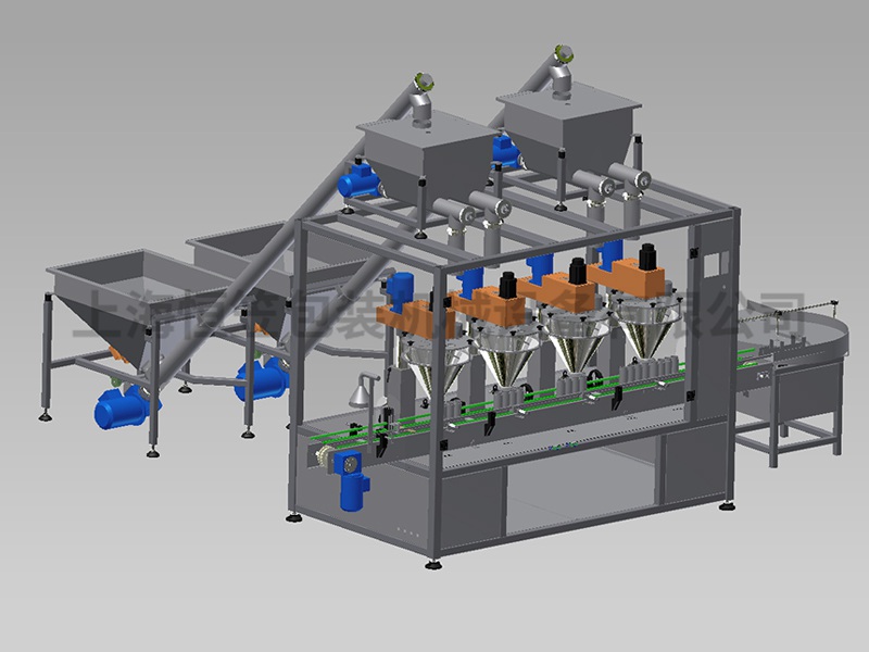 該生產線由螺旋上料機、理瓶機、四工位粉末自動灌裝機等組成。